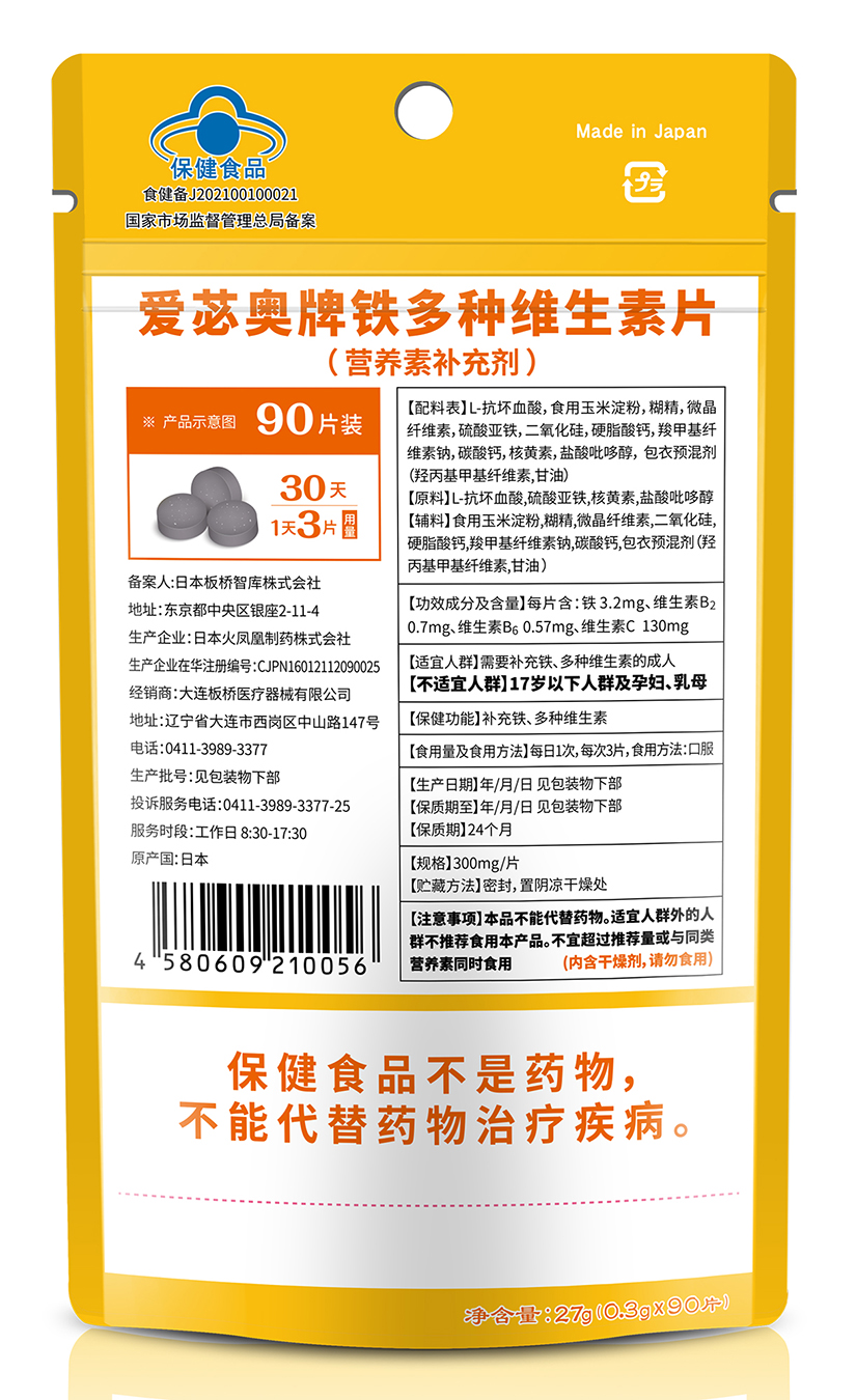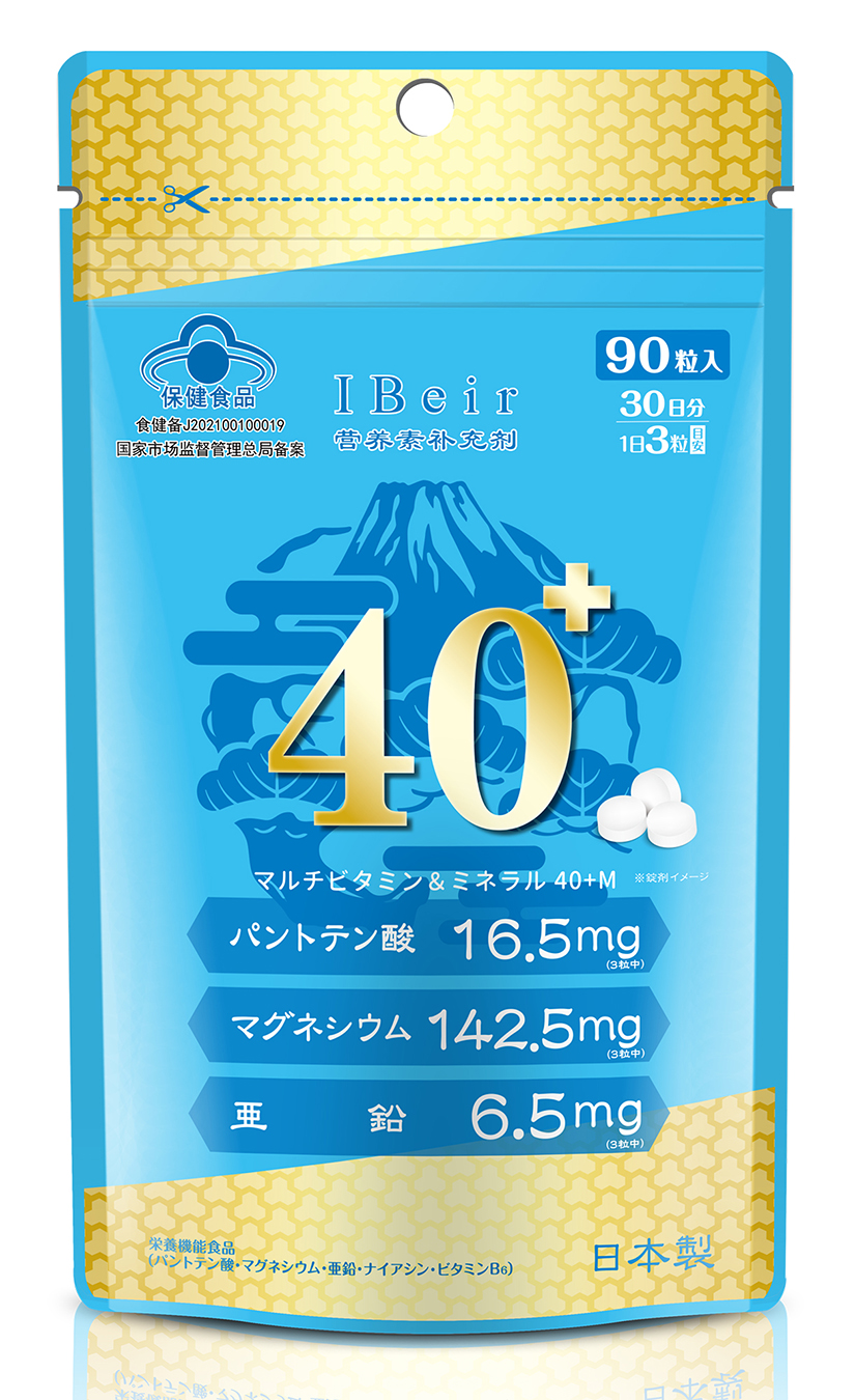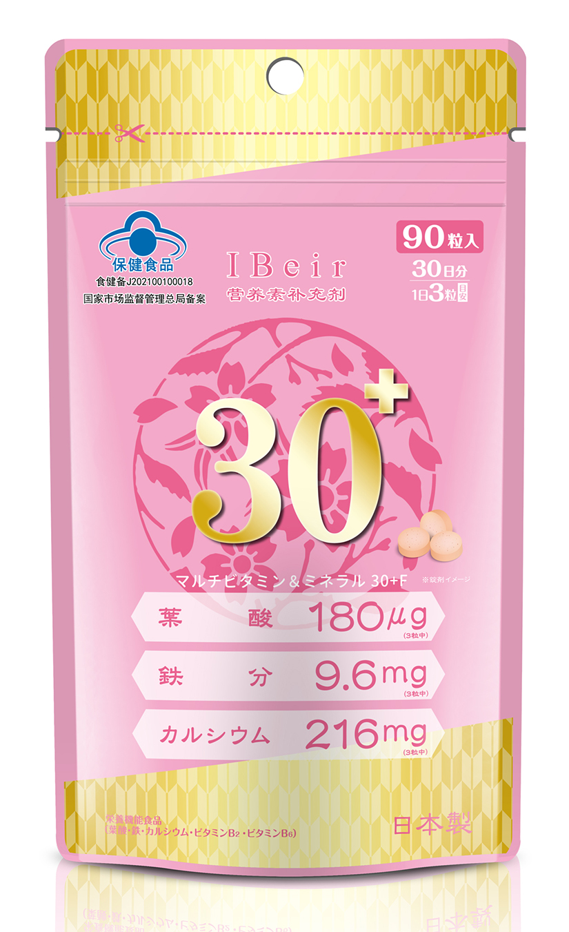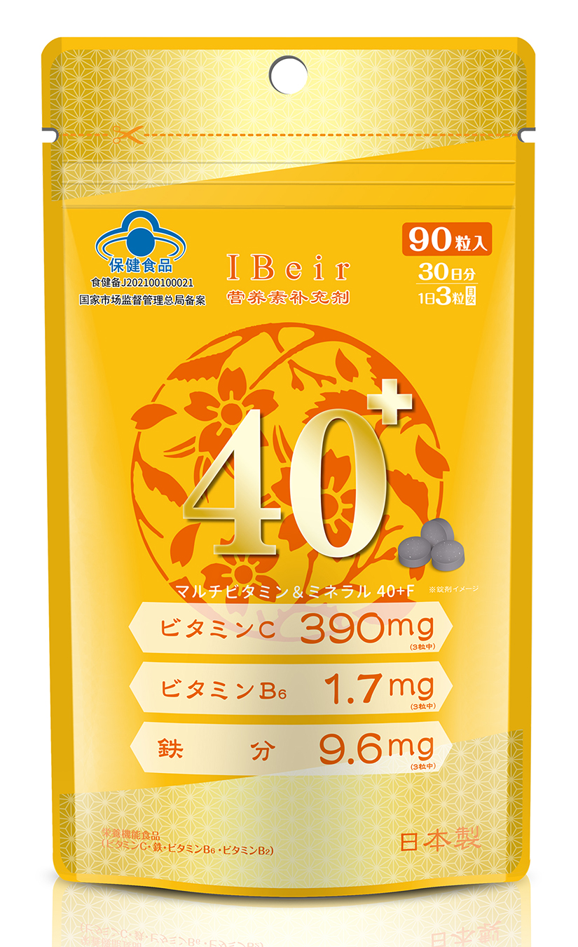 ◆ Name:IBeir Multi-vitamin&Mineral 40s+F ◆ Country of origin:Japan ◆ Contents: 27g (300mg×90tabelts) ◆ Product description: It is a nutritional functional food supplementing vitamins & minerals for women in 40s who are tend to be deficient in these nutrition. In the 40's, regardless of gender, various functions are diminished, aging begins to be worried about. The necessary nutrients to prevent aging can be divided into two. The one is to promote metabolism and the other is to prevents oxidation. Vitamin C is famous as an antioxidant that plays an important role to protect the body from active oxygen, which is one factor of aging. Vitamin B6, which has the function of keeping the health of skin, mucosa, hair, teeth etc. leading to whitening effect, is also necessary for women in their 40s. A representative nutrient that tends to be short for women is iron. About 70% of the iron in the body is a component of hemoglobin making red blood cells, and it works to supply oxygen to the body. The remaining 30% will be stored in the liver etc, but if these are insufficient, eventually cause anemia. Anemia causes short attention span, memory failure and fatigue. ◆ Nuturition fact: - Energy:3.30kcal - Protein:0g - Lipid:0.03g - Carbohydrate:0.75g - Sodium chloride equivalent:0.002g - VitaminC : 390mg - Iron : 9.6mg - VitaminB2:2.1mg - VitaminB6:1.7mg