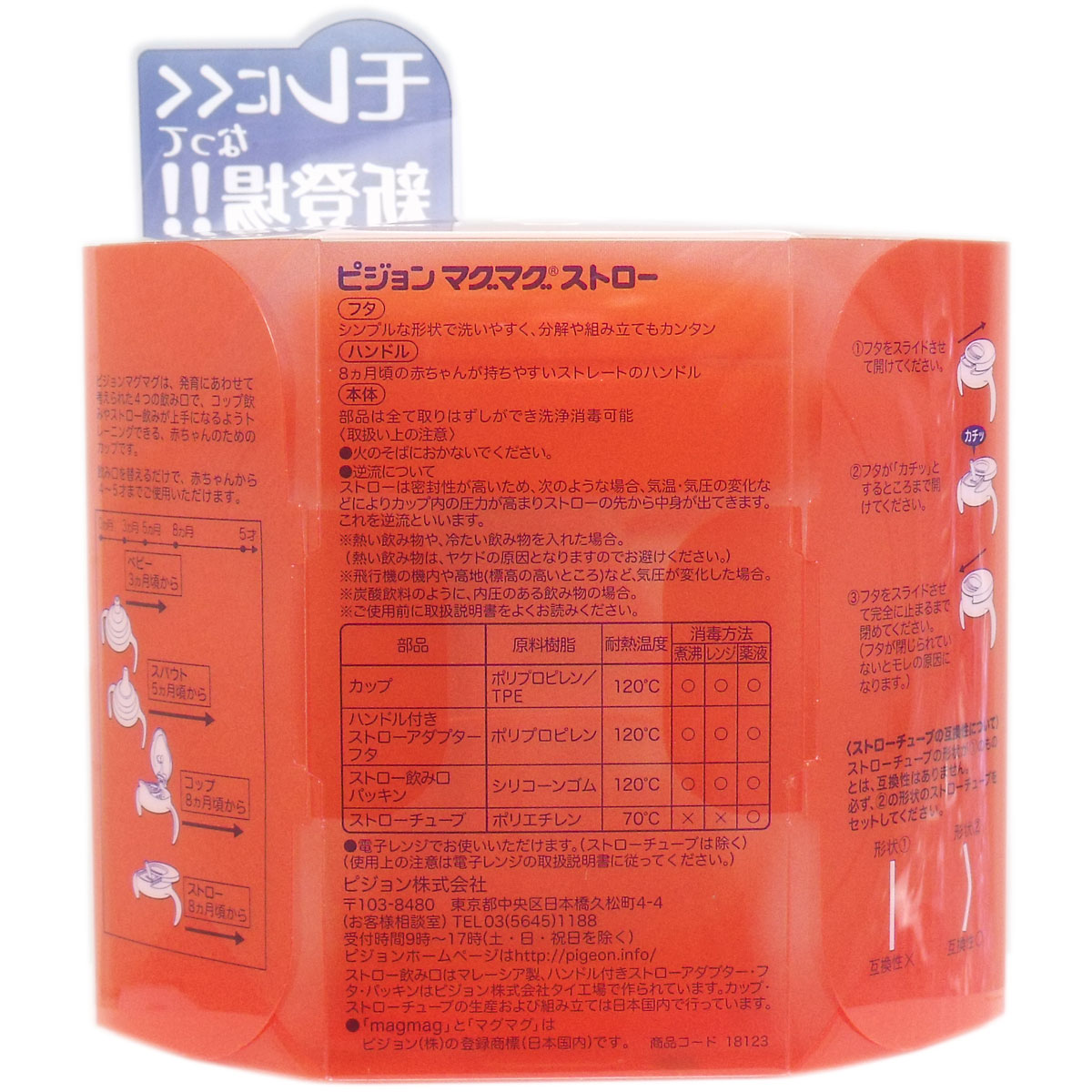 Maker: Pigeon Corporation Country of Origin: Japan Capacity: 200ml Material: Cup【Polypropylene/TPE】Straw adapter with handle・Lid【Polypropylene】Straw mouthpiece packing【silicone rubber】Straw tube【Polyethylene】 Disinfection Method: Boiling【OK】Microwave【OK】Chemical Liquid【OK】 ※Except Straw tube. Straw tube can only be disinfected by chemical solution. Heat resistant temperature: Cup・Straw adapter with handle・Lid・Straw mouthpiece packing 【120°】Straw tube【70°】 Product description:★Good for straw drinking training. ★Slide open type ★It can be tightly closed, so it is hard to leak. ★A handle with straight design that is easy to operate by baby around 8 months old. ★It is coated with a soft material, so the bottom part is hard to slip. Caution:☆Please be sure to use it at the reach of parent’s eyes to prevent stab baby’s throat and eyes. ☆Please note that it may be damaged if dropped or a strong shock is applied. ☆Please note that it will be deformed or damaged if high temperature exceeding heat resistant temperature is applied. ☆If you put hot beverages or carbonated drinks, it may leak out. ☆It may leak out depending on how to use, so please put it in a water proof bag when carrying ☆Milk may rot, so please do not carry around. ☆Cannot be used as a cookware. ☆When heating with a microwave oven, please only put a cup. Do not put parts. ☆Please note that the container is hot when taking out from the microwave oven. ☆Since the cup may be deformed, you cannot use it in the oven and grill function. ☆It cannot be frozen or thawed. ☆Please avoid heating oily foods and drinks. ☆Please do not heat the cup while it is empty. ☆When using straws, please do not put in hot drink in the cup because the contents will be blown out from the tip of the straw, which will cause burned. ☆When a baby chews a drinking mouth of a straw with his teeth, it may scratch or break. ☆Because the straw has high seal ability, the pressure in the cup is increased due to changes in temperature and atmospheric pressure, and the contents come out from the tip of the straw. ☆Back flow of the straw: ・When you put hot drinks or cold drinks in the cup.(Please avoid to put in hot drinks because it may cause burns.) ・Where air pressure changes, such as in an aircraft cabin or high altitude area. ・Drinks with internal pressure such as carbonated beverages.