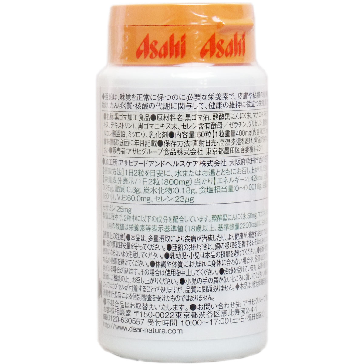 Maker: Asahi Group Foods, Ltd. Contents: 240tablets (for 30 days) Country of Origin: Japan Product description:★In addition to sesame, also contains V.E, zinc, fermented black garlic powder, maca extracts powder and selenium. ★We used domestic black garlic that fermented and aged for about one month. ★Zinc⇒Nutrients that necessary to keep taste normal. ?Nutrients that involved in the metabolism of proteins and nucleic acids, and help maintain health. ?Nutrients to help maintain healthy skin and mucous membranes. ★Recommended for those who want to send everyday with stamina and healthy. Intake Method: As a supplement, take 2 tablets a day as a guide with water or warm water. Caution:☆Please observe the recommended daily intake. ☆This product does not cure the disease or promotes health more by intake a lot. ☆Please be careful not to overdose. When you are taking in too much zinc, it may inhibit the absorption of copper. ☆Those who are pregnant (pregnancy planner), breast-feeding, infants, children, please avoid taking this product. ☆Depending on your physical condition and constitution, it may not fit your body or allergy symptoms may appear. In that case, please stop taking it immediately and consult your doctor. ☆If you are receiving medical treatment or taking medicine, please consult your doctor before you take. ☆Please keep out of reach of Children and Infants. ☆Please do not store indirect sunlight and high temperature places. Please store at a normal temperature. ☆Depending on the storage environment, capsules may adhere, but there is no problem with quality. Ingredients: Black sesame oil, Fermented black garlic powder, Maca extract powder (maca extract, dextrin), Black sesame extract powder, Selenium-containing yeast/Gelatin, Glycerin, Acetic acid V.E, Zinc gluconate, Beeswax, Emulsifier Nutrition Facts (Daily intake [2 tablets]) Calories: 4.42kcal Protein: 0.25g Fat: 0.3g Carbohydrate: 0.18g Salt equivalent: 0〜0.0018g Zinc: 7.0mg Vitamin E: 60.0mg Selenium: 23μg Sesame: 25mg Fermented black garlic powder: 60mg Maca extract powder: 60mg