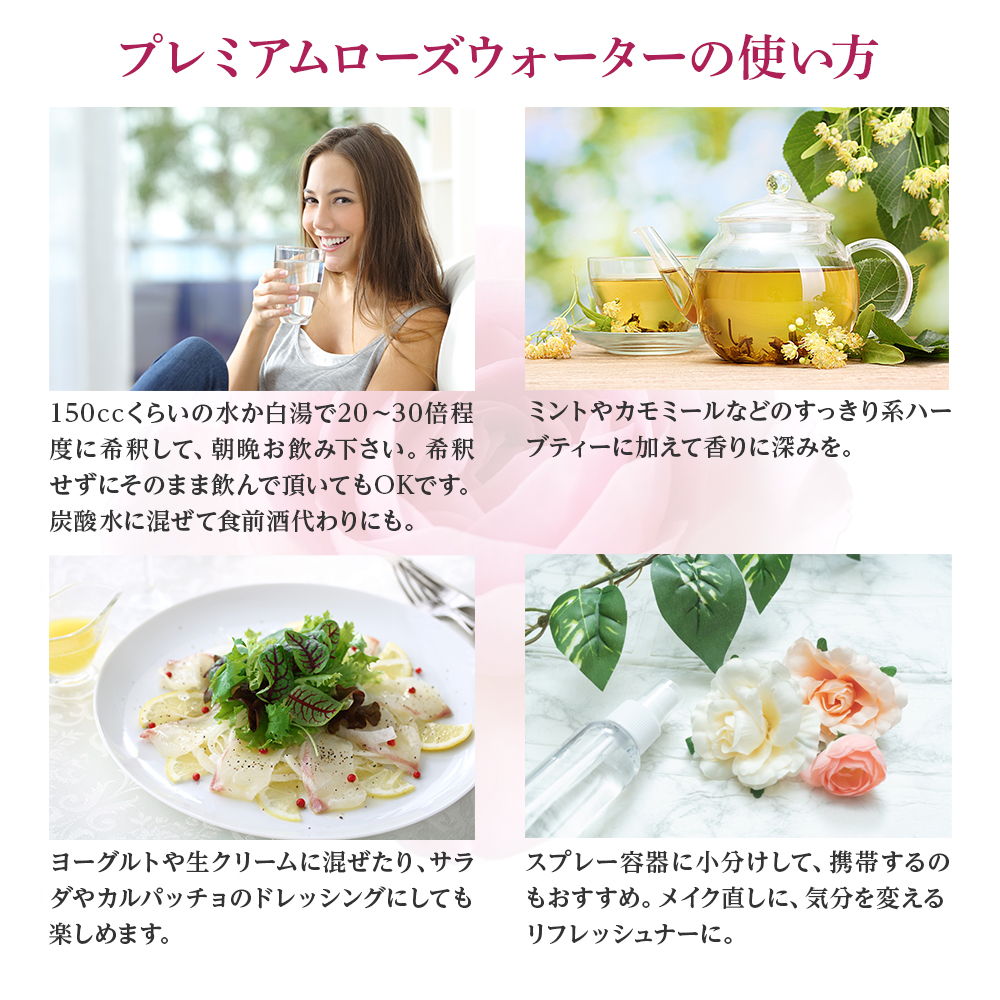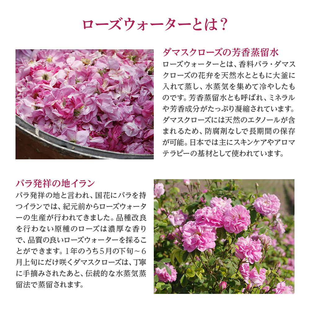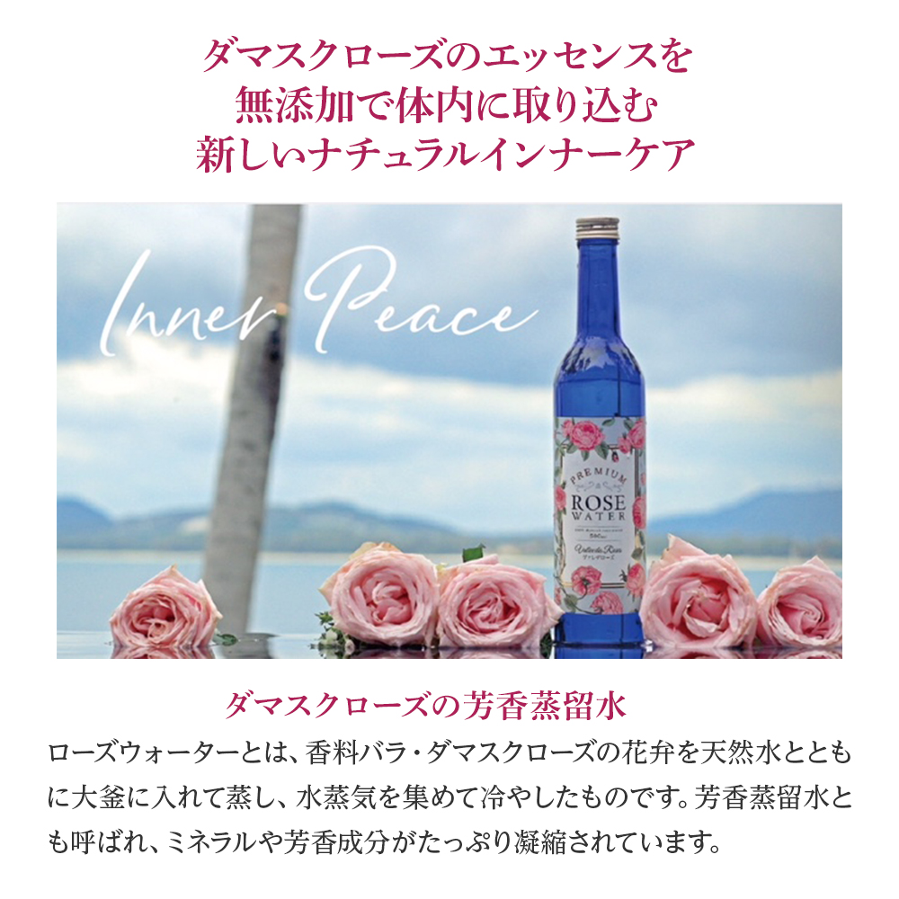 【商品情報】 商品名:ヴァレデローズ プレミアムローズウォーター 容量:500ml 商品詳細:香料バラ・ダマスクローズの花弁を天然水とともに大釜に入れて蒸し、水蒸気を集めて冷やしたローズウォーター(ドリンク用)です。バラ発祥の地と言われ、国花にバラを持つイラン産のローズを使用しています。 【内容詳細】 ・品名:バラ天然着香料 ・原材料名:ダマスクバラ花弁(イラン産) ・栄養成分表示 100mLあたり エネルギー:0kcal、炭水化物:0g、たんぱく質:0g、ナトリウム:2mg、脂質:0g、糖質:0g 【使用方法】 お好みにあわせて、水または白湯などで20-30倍程度に希釈しお飲み下さい。 ・スプレー容器に入れ替えてリフレッシュナーに ・メイク直しに(余分な皮脂を抑えます) ・頭皮に吹きかけて、地肌を元気に ・寝具に吹きかけて優雅な眠りを ・パソコンの疲れ目にも 【ご使用上の注意】 ・開封後要冷蔵 ・賞味期限約2年 ・国内で殺菌、充填しています ・天然原料のため、まれに白いオリのようなものが出る場合がございますが、品質に影響はありません 原産国:日本