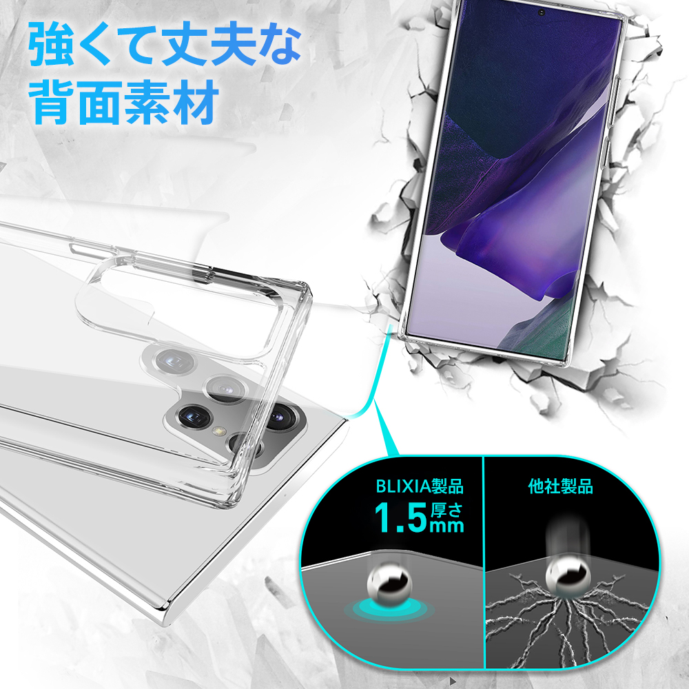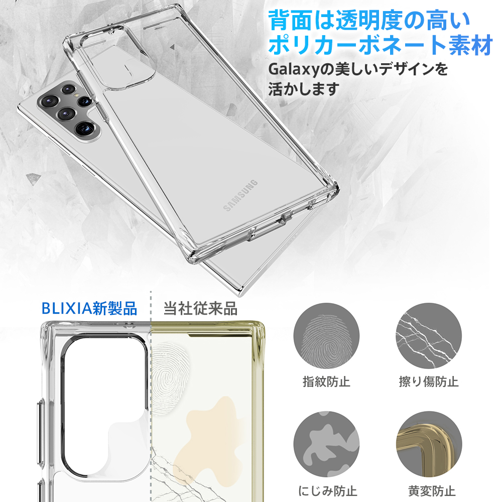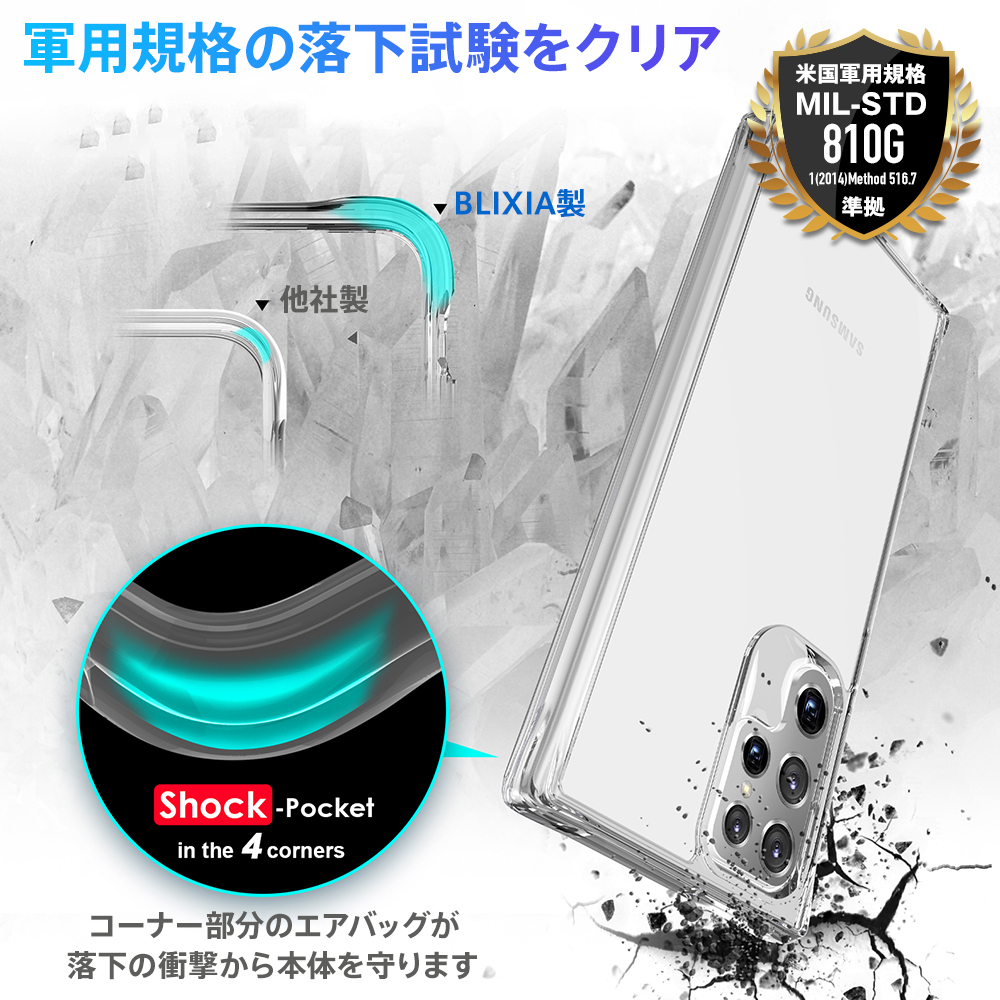 ■透明感のあるボディと柔軟な外縁■ BLIXIAブランドから登場したGalaxy S22 Ultra用の米軍MIL規格SGS認証取得 TPU+背面ポリカーポネート素材クリアケースです。 スタイリッシュなGalaxyのデザインを活かしなら、保護力を高めます。 米軍MIL規格SGS認証取得に加え、3mの高さから落下試験を行い52回破損なしの強度を誇るケースとなっております。 ケース側面にはしなやかで弾力性のあるTPU素材を採用。 背面は固く透明度が高いPC素材を使用しており、キズに強く、万一の落下の際にも背面への衝撃を緩和します。 ケースを装着したままのワイヤレス充電対応です。 【対応機種】 Galaxy S22 Ultra 【材質】 背面:ポリカーポネート(PC)、側面:TPUソフト素材 【カラー】 クリア