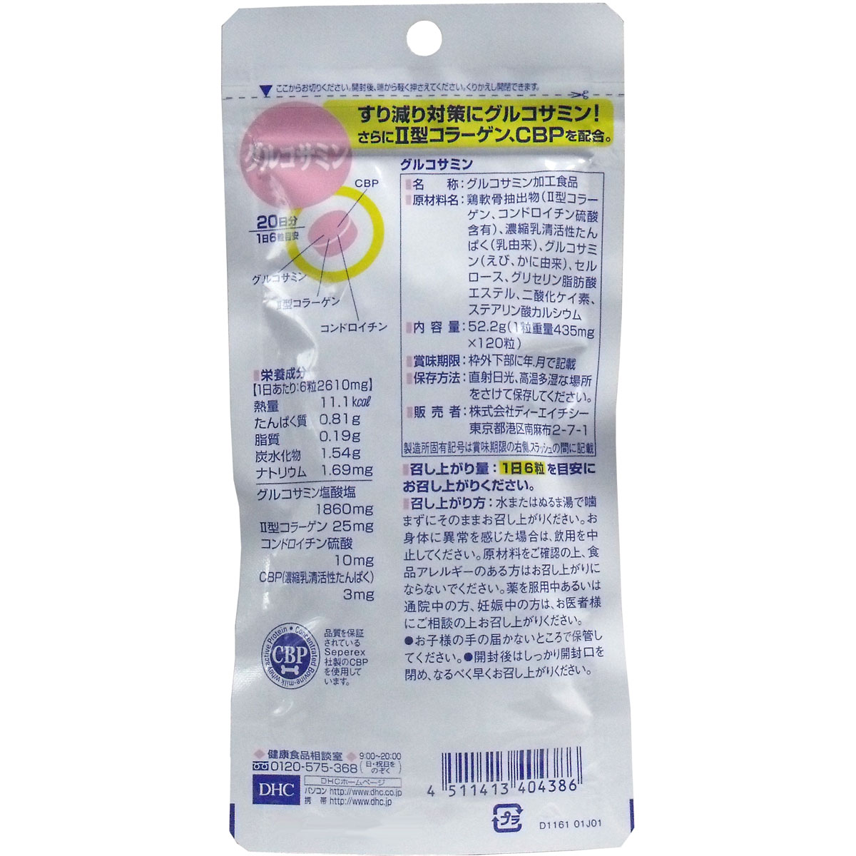 メーカー:DHC 容量:120粒 原産国:日本 商品説明: ★グルコサミンは軟骨を作るのに必要な成分。アミノ糖(ムコ多糖類)の一種で体内にある成分ですが、年齢を重ねるごとに減少します。DHCの「グルコサミン」はカニやエビの甲羅に含まれるキチン質を分解し、天然のグルコサミンを抽出したサプリメントです。II型コラーゲンやコンドロイチン、CBPも配合し、スムーズな動きをサポートします。 栄養成分 : グルコサミン 主要原材料:鶏軟骨抽出物(II型コラーゲン、コンドロイチン硫酸含有)、濃縮乳清活性たんぱく(乳由来)、グルコサミン(えび、かに由来) 調整剤等:澱粉、セルロース、グリセリン脂肪酸エステル、二酸化ケイ素 注意:☆本品は過剰摂取をさけ、1日の摂取目安量を超えないようご注意いただく商品です。