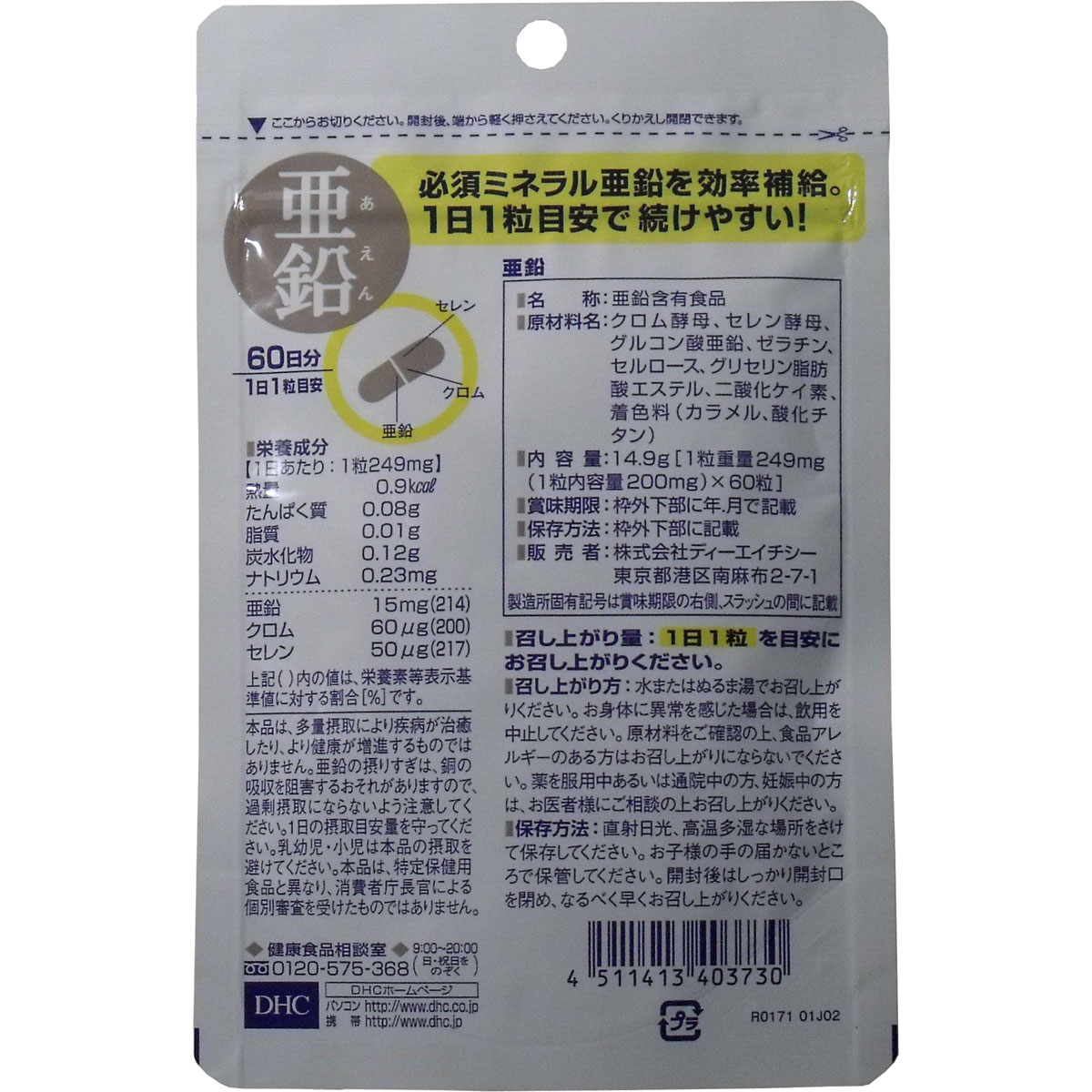 メーカー:DHC 容量:60粒 原産国:日本 商品説明: ★健康な体をサポート。 ★体内の約300種類の酵素に関わる必須ミネラルである亜鉛に、セレンやクロムなどのミネラルをプラスしたサプリメント。