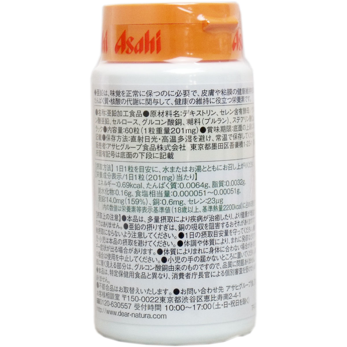 メーカー:アサヒ食品 容量:60粒 原産国:日本 商品説明: ★国産、無香料・無着色・保存料無添加のサプリメント ★1粒に亜鉛14mg配合 原材料 : セレン含有酵母、セルロース、グルコン酸亜鉛、グルコン酸銅、ステアリン酸Ca、デンプングリコール酸Na、微粒酸化ケイ素 栄養成分 : 【栄養成分/1粒(250mg)あたり】エネルギー0.87kcal、たんぱく質0.007g、脂質0.001~0.007g、炭水化物0.20g、ナトリウム0.13mg、亜鉛14mg、銅0.6mg、セレン23μg 本品は、多量摂取により疫病が治癒したり、より健康が増進するものではありません。1日の摂取目安量を守ってください。表面に青く見える部分は、グルコン酸銅由来のものですので、品質に問題ありません。