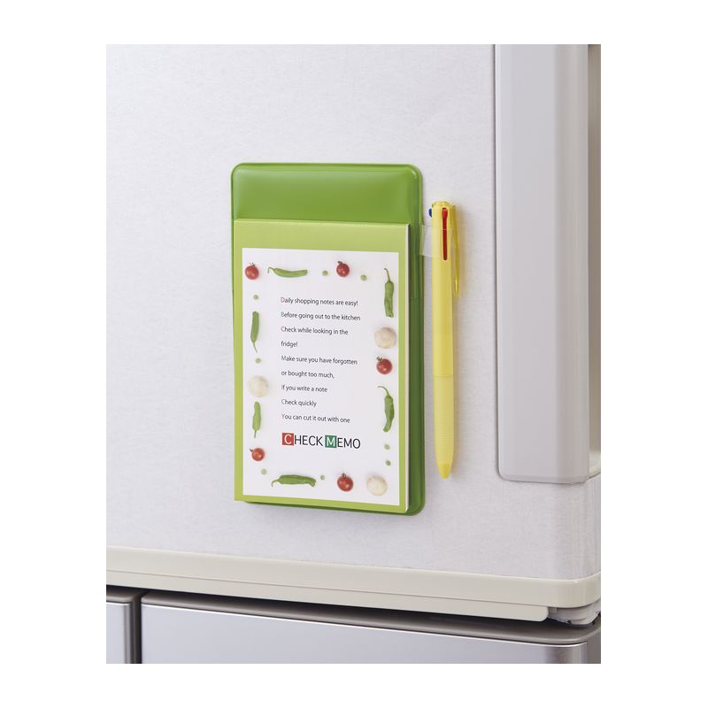 【セールスポイント】 マグネット付きプレートで冷蔵庫に取り付けOK! 冷蔵庫に付けて、切れた食材をメモしておけば、お買い物に行くときに、剥がして持っていくだけ。買い物忘れ防止に役立つチェックメモ。 【サイズ】 137×10×190mm 【総重量】 約165g 【内容】 185×106×10mm・メモ帳50枚 【材質】 PVC、紙