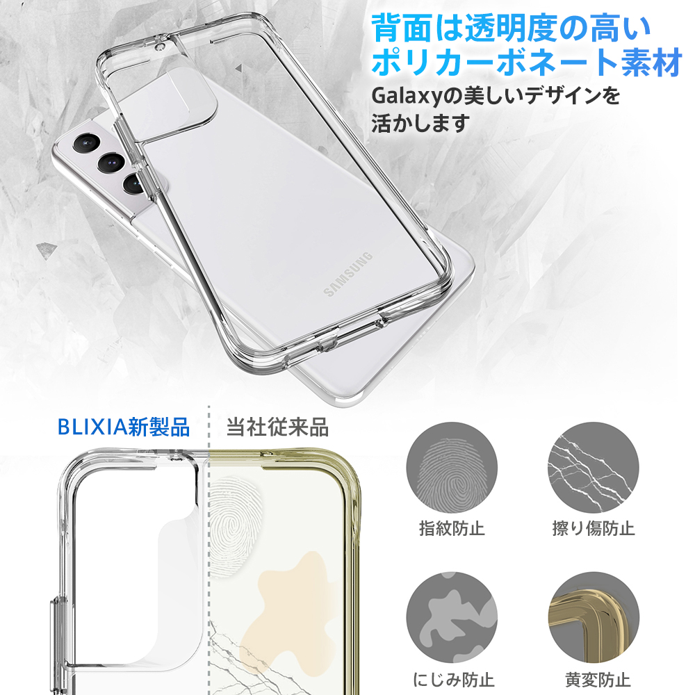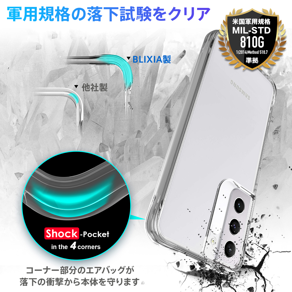 ■ 透明机身和灵活的外边缘 ■ BLIXIA 品牌出现的 Galaxy S22 S22 Plus 的美国军用 MIL 标准 SGS 认证 TPU + 背面聚碳酸酯材料透明外壳。 利用时尚的 Galaxy 设计来增加保护。 除了获得美国军用 MIL 标准 SGS 认证外,它还通过从 3 m 的高度进行跌落测试,具有 52 次不损坏的强度。 表壳侧面采用柔软有弹性的 TPU 材料。 背面由坚硬且高度透明的 PC 材料制成,即使在不太可能发生的跌倒情况下,也能抗刮擦并缓冲对背面的冲击。 它支持连接外壳的无线充电。 【适用机型】 三星 Galaxy S22 三星 Galaxy S22 plus [材料] 背面:聚碳酸酯 (PC),侧面:TPU 软质材料 【颜色】 透明