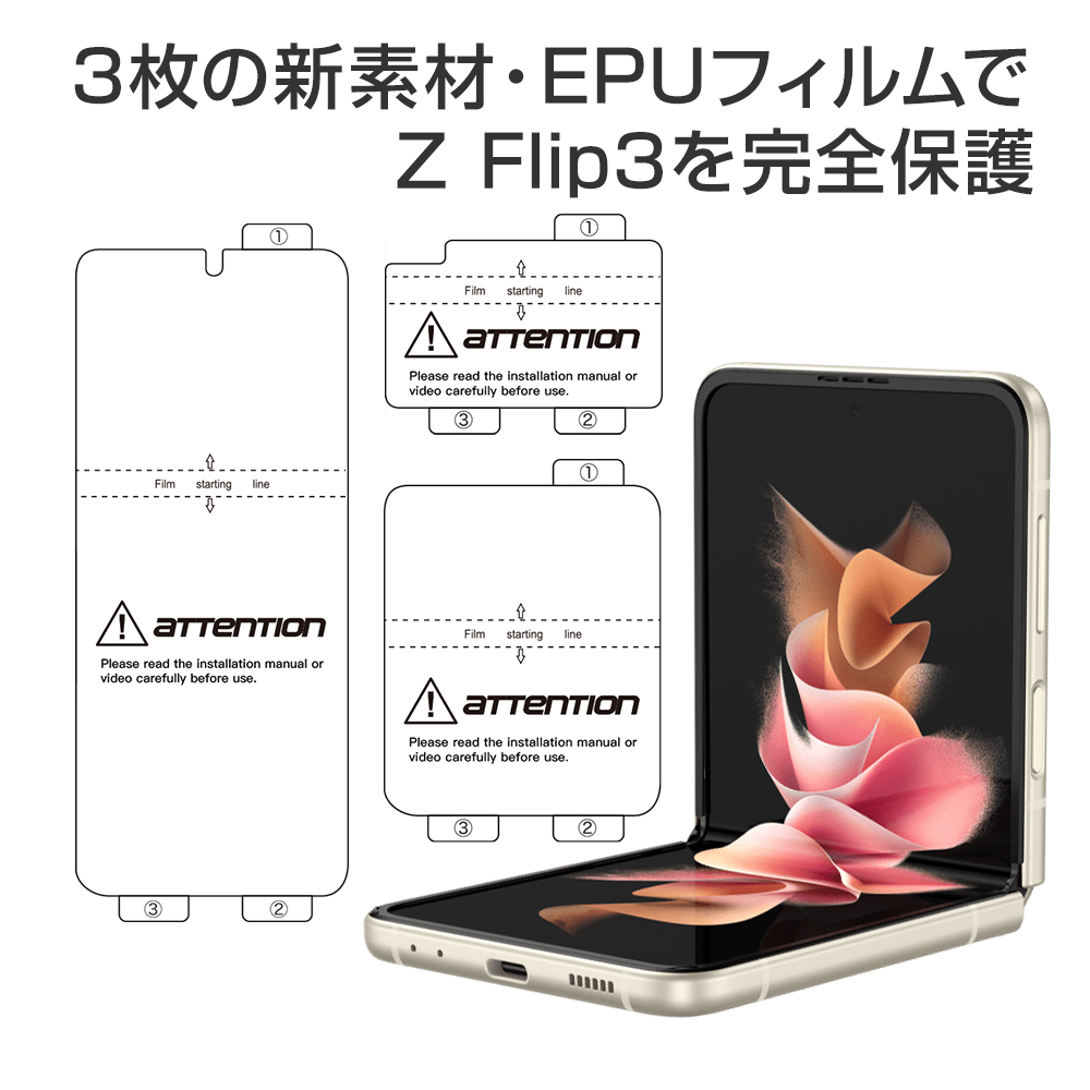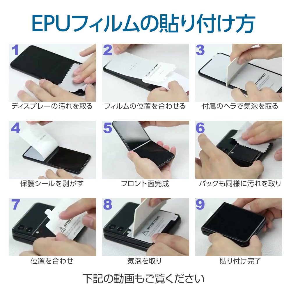 ■高透明度类型的薄膜 ■ BLIXIA品牌的Galaxy Z Flip3高透光型EPU保护膜是一款集强度和美观于一身的屏幕保护加固膜。 【灵活的EPU材料】 EPU材料独特的弹性和柔韧性甚至可以保护设备的圆形部分,这是普通PET薄膜所不能做到的。 【抗指纹】 驱油和驱水层可以防止指纹、汗水、油和其他污渍粘附在薄膜上,并且容易擦拭。 防止指纹,附着的污垢也很容易擦掉,维护也很容易。 是游戏的理想选择,等等。 运行平稳顺畅。 【易于应用】 包装中包括一个特殊的粘合剂套件。 该套件使任何人都能轻松地贴膜,而不会出现任何滑移。 *注意:在使用本产品之前,请观看应用程序的视频。