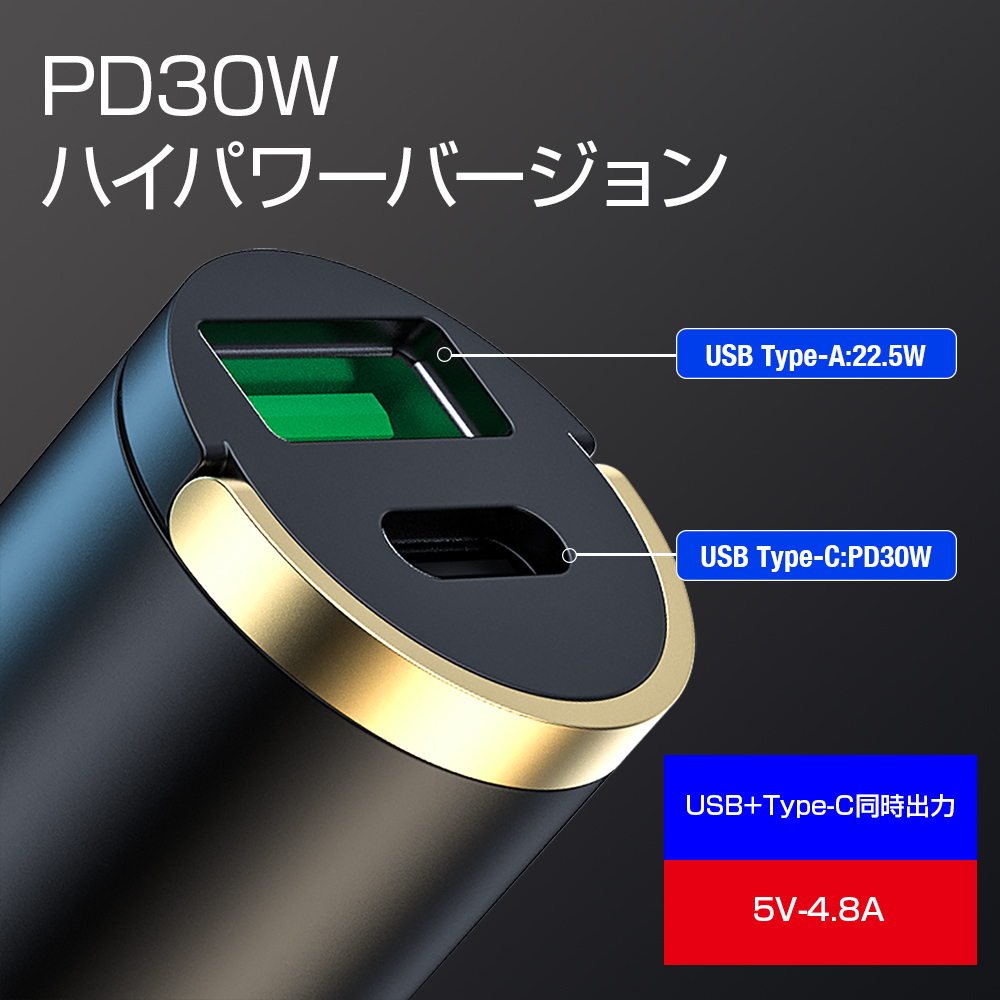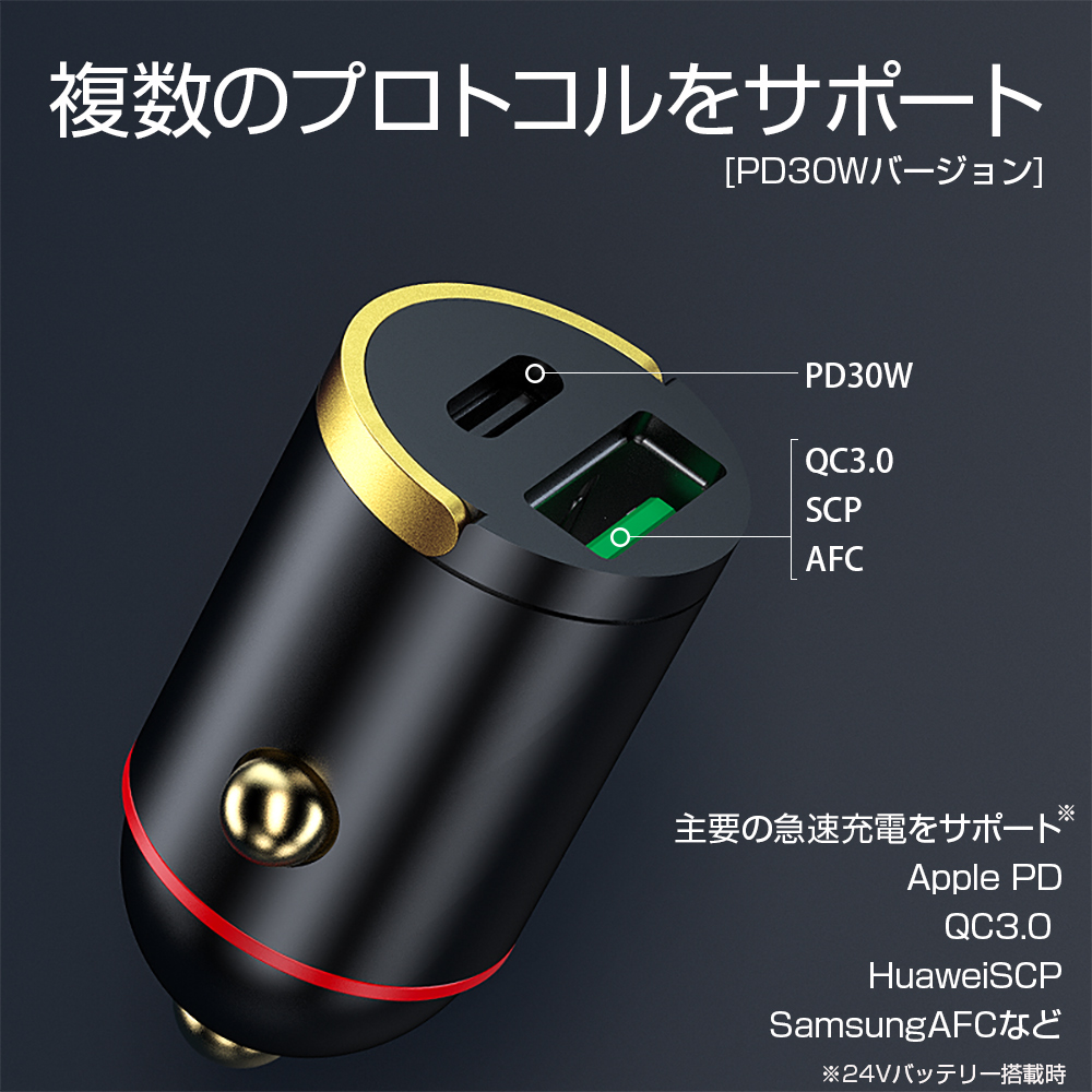 【PD快速充电】 30分钟内充电80%,快速而方便。 (当配备了24V电池时)。 【自动分流技术】 智能地实时识别电流,而不会给所连接的电子设备或车载电池带来负担。 智能芯片控制防止过流、短路、过压、欠压、过热和过功率。 内置的LED显示屏还可以实时监测电池电压。 【[广泛的兼容性】 该产品可与多种设备兼容,包括硬盘录像机、空气净化器、数码相机、手持式清洁器和各种便携式游戏设备。 智能手机与安卓和iOS移动设备兼容。 (三星Galaxy系列、谷歌pixel系列、华为、iPhone 13mini / 13 / 13 Pro / 13 Pro Max / iPhone 12/12pro max/12/11/11 Pro/Max/XS/Max/XR/X/8 加8) 当用C型车给笔记本电脑充电时,只支持12-24V的车辆。 【紧凑的尺寸和铝合金机身】 直径只有20毫米。 节省空间的尺寸,通过机身两侧的高弹性搭扣牢牢固定在雪茄座上,不会因为汽车的震动而脱落。 最先进的铝合金机身防刮伤,并具有良好的散热性能。 【输入】 12-24V 【输出】 Type-C: 5V-3A 9V-3A 12V-2.5A 15V-2A 20V-1.5A Max30W USB-A: 5V-3A 最大22.5W