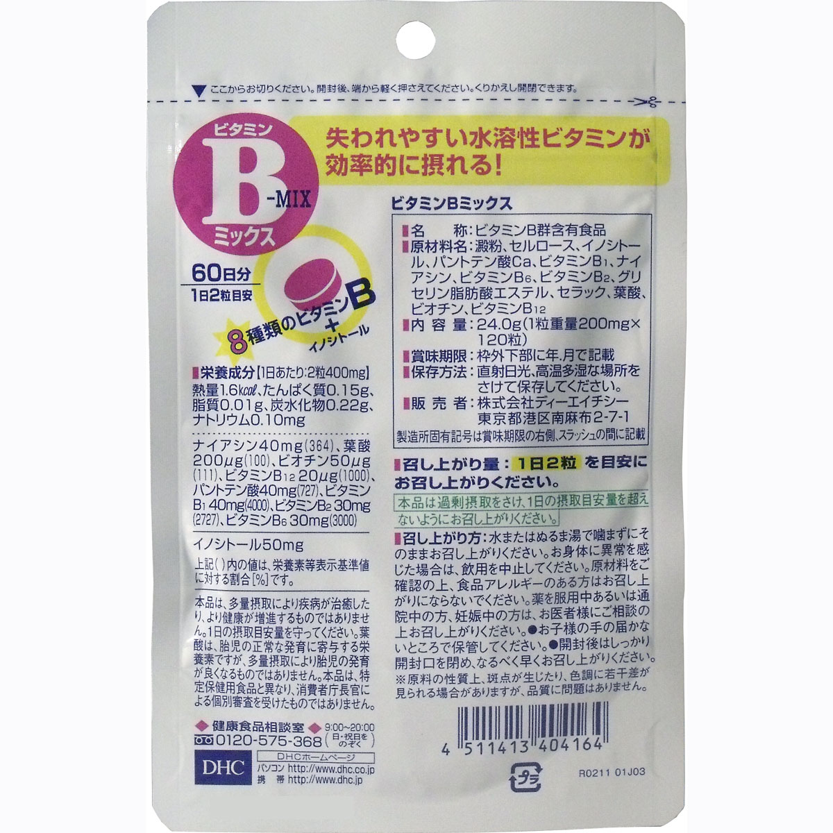 生产厂家:DHC 净含量:120粒 原产国:日本 产品说明:集中摄取各种维生素B群,让您保持健康和美丽。加量不加价60日量。 营养成分: 维生素B 主要原材料:肌醇,泛酸Ca,维生素B1,维生素PP,维生素B6,维生素B2,叶酸, 生物素,维生素B12 调整剂:淀粉,纤维素,甘油脂肪酸酯,虫胶 注意: ☆本产品不具备通过大量服用,达到治疗疾病,增强体质的功效。请按1日规定的量服用。 ☆本产品非特定保健品,因此未经过消费厅长官的个别审查。 ☆服用本产品前请先确认是否对原材料的成分有过敏情况。 ☆为避免过量摄取,请按1日规定的量服用。