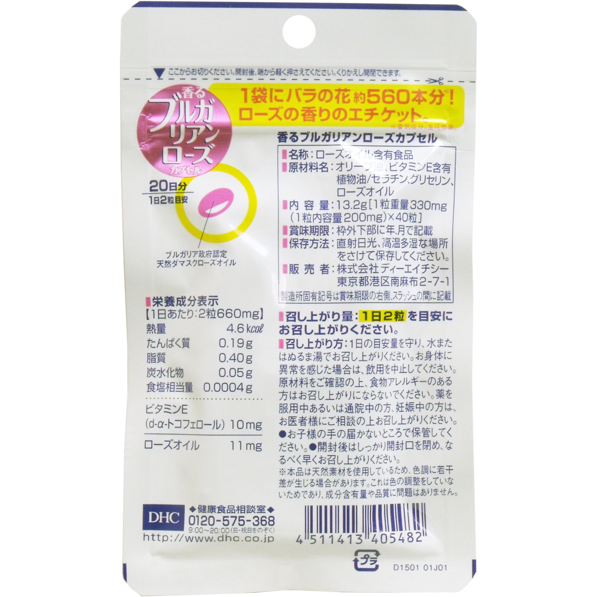 生产厂家:DHC 净含量:40粒 原产国:日本 产品说明: ★ 经保加利亚政府指定的认证机关批准的高级美容精油。 ★ 将560枝保家利亚玫瑰的天然香气成分进行压缩。 ★ 推荐使用人群:对自己身体或呼吸的气味介意,不习惯使用香水,喜欢自然清香的人群。 ★ 天然玫瑰的芳香洋溢于您的全身上下。 ★ 主要原材料:玫瑰精油 ★ 调整剂等:橄榄油,含有维生素E植物油 ★ 被包剂:明胶,甘油