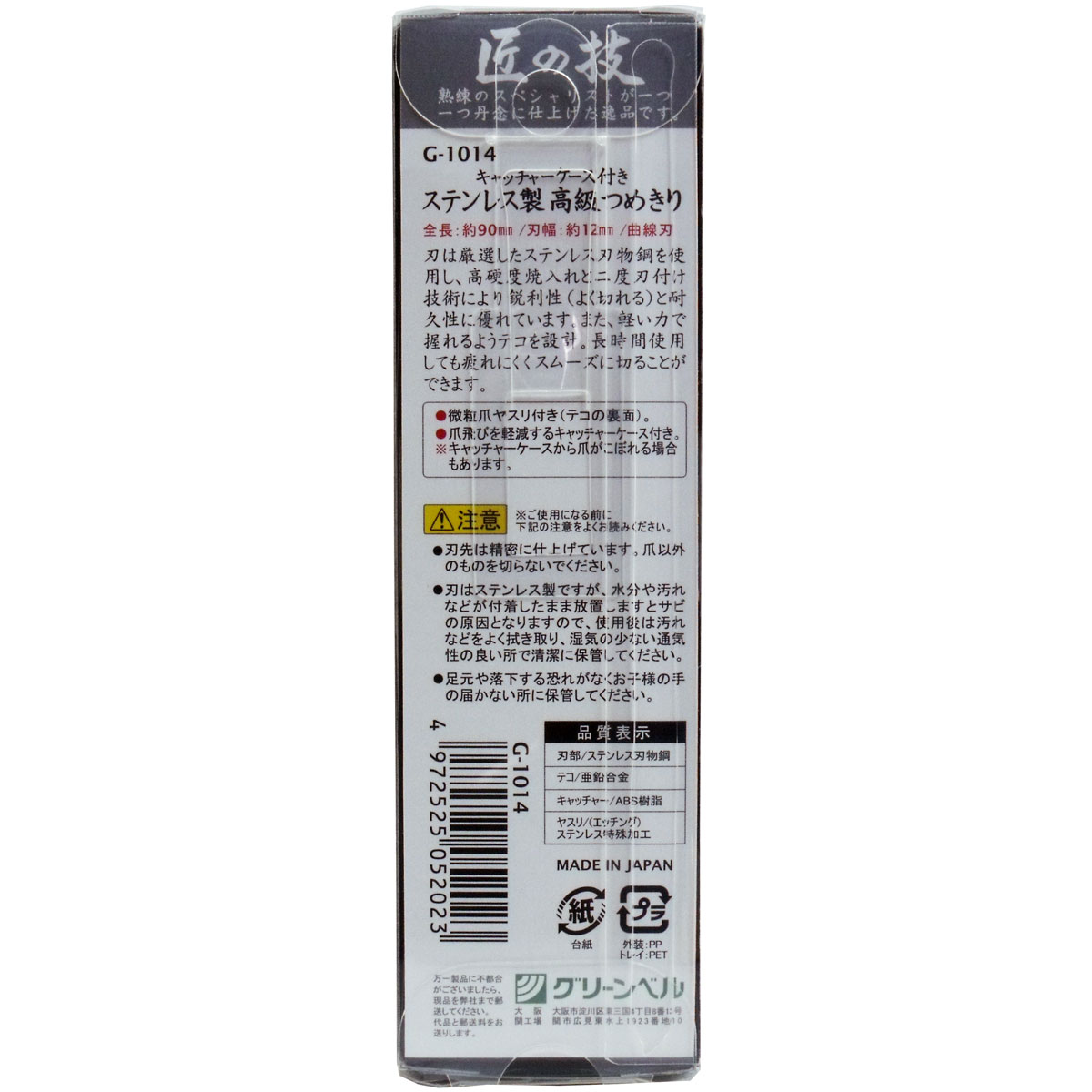 可以剪掉厚重的指甲! 每一件商品都由技术娴熟的工匠精心制作。 刀口采用精心挑选的不锈钢材质。经热处理和两次刀片镶嵌技术,刀口锋利,持久耐用。 ●舒适及贴合手型的设计。握感舒适,剪指甲轻松不费力。 ●带有均匀颗粒的指甲锉 ●带有防止指甲屑飞溅的不锈钢收纳盒 单品尺寸:38X132X22mm 单品重量:约70g 数量:1个 制造国:日本 【曲线刀口】 全长・・・约90mm 刀宽・・・约12mm 【品质表示】 商品・・・不锈钢 手柄・・・锌合金 指甲锉・・・特殊加工的不锈钢 收纳盒・・・ABS树脂 【注意事项】 ・使用前请仔细阅读注意事项 ・由于刀口很精密,请不要剪指甲以外的东西。 ・虽然刀片是不锈钢材质,但是如果水分和污渍长时间残留于刀片表面的,可能导致刀片生锈。使用后,请将污渍等擦干净,存放于通风干燥之处。 ・请勿将指甲刀放置于脚旁或有坠落危险之处。请存放在儿童接触不到的地方。