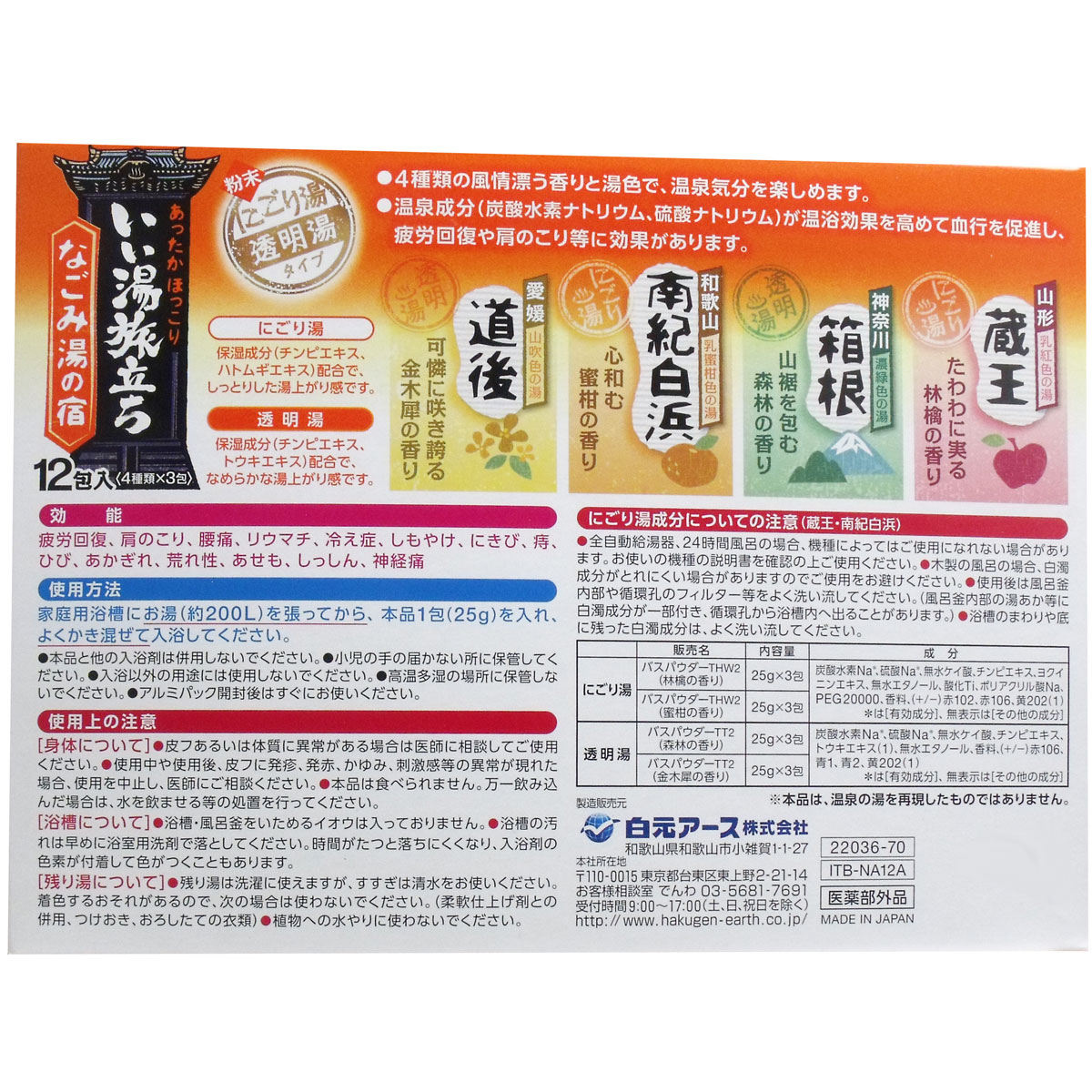单品包装尺寸:170X126X45mm 单品包装重量:约370g 净含量:12包 生产国:日本 温暖祥和♪ 4种不同芳香和颜色,畅享牛奶温泉乐趣 ●碳酸气体的提温效果可以促进血液循环、缓解下肢发冷和肩膀酸痛・腰痛症状。 ●透明泉水 配合陈皮和トウキ提取物保湿成分,让身体润滑持久 ★山形/蔵王 ・乳紅色泉水/浊泉 ・硕果累累的苹果之香 ★神奈川/箱根 ・浓绿色湯/透明泉水 ・环绕山岭的森林之香 ★和歌山/南紀白浜 ・乳蜜柑泉水/浊泉 ・治愈心灵的柑橘之香 ★愛媛/道後 ・山吹色泉水/透明泉水 ・可爱迷人的金木犀之香 【効能】 缓解疲劳、下肢发冷、肩膀酸痛、瘟疹、湿疹、皮肤龟裂、痤疮、腰痛、神经痛、痔疮、风湿、冻疮、皲裂 【成分】 <浊泉> 有効成分・・・炭酸水素Na、硫酸Na 其他成分・・・无水硅酸、陈皮提取物,薏苡仁提取物、无水乙醇、酸化Ti、聚丙烯酸Na、PEG20000、香料、(+/-)红102、红106、黄202(1) <透明泉水> 有効成分・・・炭酸水素Na、硫酸Na 其他成分・・・无水硅酸、陈皮提取物、当帰提取物(1)、无水乙醇、香料、(+/-)红106、绿1、绿2、黄202(1) 【使用方法】 ・家用浴缸注完热水(200L)后,将1包该产品(45g)放入浴缸溶解 ・当泡沫消失后说明碳酸气体已经溶入热水中,效果持久。入浴剂溶解2小时内入浴效果最佳 ・请勿将本产品与其他入浴剂混合使用 ・请将产品放置在幼儿接触不到之处 ・请勿将产品用于入浴之外的用途 ・请避开高温多湿场所保存 ・铝敷层开封后请立即使用产品 【注意】 <关于身体> ・由于碳酸气体原因,入浴后少数情况可能引起咳嗽,请注意。 ・皮肤或身体有异常情况,请咨询相关医生 ・使用中或使用后出现皮肤出疹、发红、发痒、刺激感等异常状况,请停止使用并咨询相关医生 ・本产品不可食用。万一误食,请立即饮用大量的水进行处理 <关于浴缸> ・请不要硫磺等物质放入浴缸 ・天然大理石浴缸的表面光泽有变暗的可能 ・浴缸出现污渍请尽快用浴室洗洁剂清洗。否则,时间持续越久越不易清洗,入浴剂的色素也可能附着在上面 <关于入浴后的热水> ・入浴后的水可以用来洗涤衣服,但请用清水进行漂洗。衣服有被染色的可能,请以下情况不要使用 (不可与柔软剂一起使用、不可将衣服长时间浸泡、不可洗涤新衣服) ・请不要将入浴后的水用来浇灌植物