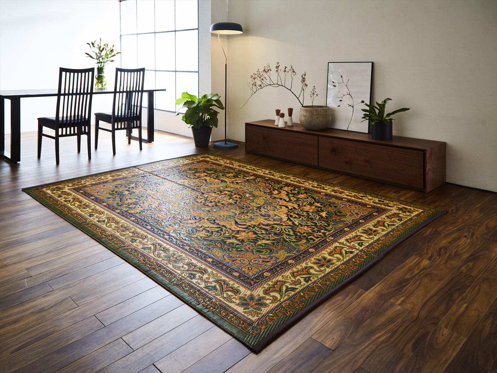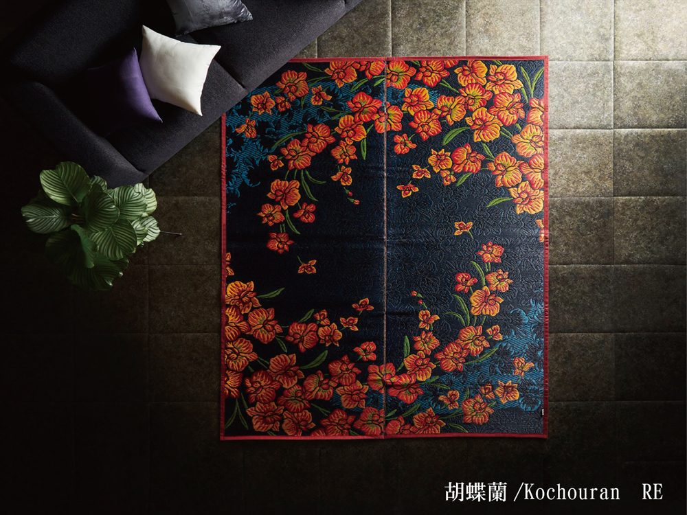 Tora” – a rush rug with an overwhelming presence. Elaborately woven with carefully selected rush, this rug boasts a high quality that improves with use. Each stalk of rush was grown lovingly, and each genuine rush rug was made by hand. The essence of the rare and valuable rush is embodied in this rug. Create a relaxing atmosphere in the space where everyone gathers. Experience togetherness with the natural warmth of this rug. A great hospitality, connecting people’s hearts in the midst of life. We present each piece to become an irreplaceable part of your life. It has a bold design of 2 tigers glaring at each other. This impressive design works well with rush, as it is used to create delicate patterns and facial expressions of the tigers. ・This rug uses a 3-weave method, allowing for a rich expression of colors. ・The type of rush used is unpigmented soil grass. It boasts a shiny surface and is smooth to the touch. ・Bleaching the rush before usage allows patterns to be displayed more clearly and beautifully. Rush is normally machine-dried, however the bleaching process takes time and effort as it requires being hung outside in the sun. Size: Approximately 191 cm x 250 cm Material: Rush Border (100% cotton)